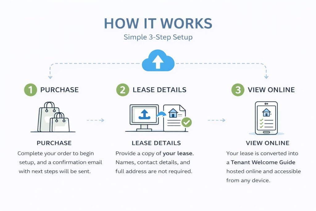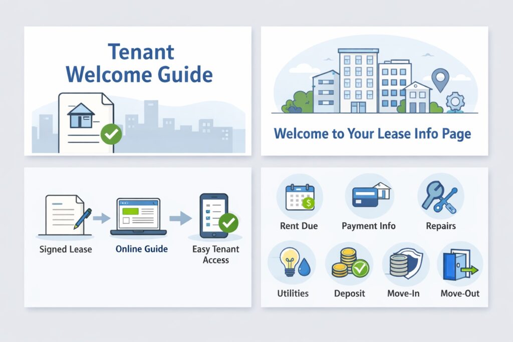 We convert your existing lease agreement into a clean, structured online welcome guide that presents rent dates, fees, key terms, and responsibilities in a format tenants can check anytime on their phone.